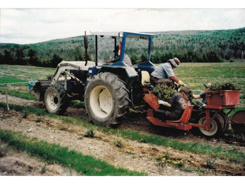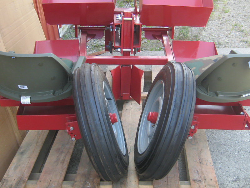 We built this planter for our own use. It works great in sod or plowed ground for small or large transplants. The planter weighs 760 lbs. Towing specifications: three-point hitch-category 1 or 2. The minimum horsepower of the towing tractor is 16 HP. The planter is equipped for two individuals to be seated and to plant. To plant in sandy or loamy soil, set furrowing shoe to desired depth (up to 9" maximum). Tree planter should be made to point slightly downward when attached to tractor or tow vehicle. This will insure an aggressive cut by the coulture wheel. Two people should be used during planting process. If you are to use one person, the opposite seat should be weighted at approx. 160 lbs. This insures that the packing wheels (rubber wheels in rear) will be able to repack the soil that was displaced by furrowing shoe. Drive shoe spacers come with the Tree Planter. These spacers are used to set the width of the wings of the shoe, which in turn, determines the width of the furrow. The three spacers are as follows: small spacer will give you a 4" furrow, medium spacer creates a 6" furrow, and the large spacer creates a 8" furrow. The size of the spacer is determined by the individual planting requirements of the user. An optional Spacing Wheel Attachment may also be used with the Kelco Tree Planter. This is an enclosed metal wheel which is attached to the side of the planter and rides on the ground next to the planter. Inside the metal wheel is a spring that rides within a metal tube. The spring makes a clunking sound once during a full rotation of the wheel. When clunking sound is heard, person planting trees should immediately put tree in furrow. The spacer wheels come in the various sizes: from 4 to 8 feet. A wheel can also be special ordered to users exact requirements. To plant trees in a straight row, the driver of the tow vehicle should pick a line of sight object in front of him. This object can then be sighted with an object on the tow vehicle it self. Once the two objects are in direct line of sight, you can commence the planting project. TIP:Once first row of trees has been planted, a rod, with one end attached to front of tow vehicle, and a rope or light chain approximately the height of tractor from ground up attached to other end, can be used to keep rows straight. The hanging chain or rope is used to go lightly over your first row of trees and is used to insure that the second row and so on are equidistant from the first row. SPECIFICATIONS