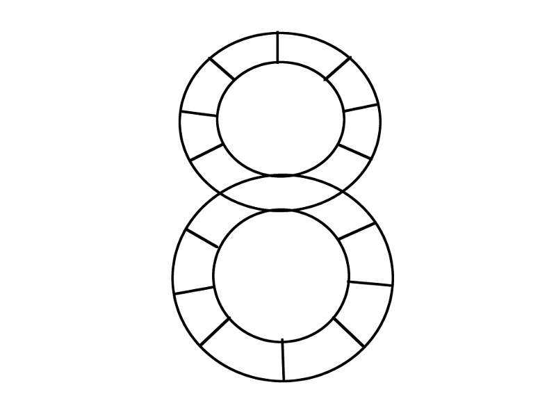 A Double-rail wire shape for wire-wrapping wreath material to make Monograms and Numbers. A unique product to offer at your retail store. Your customers can decorate their homes with their initials, house numbers, and words such as "JOY", "PEACE", "NOEL"... The possibilities are endless.