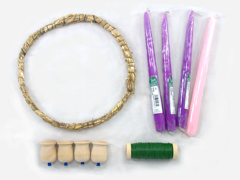 Centerpiece will be made in the same manner as a single faced wreath. Best results will be obtained if greens are cut approximately six inches in lengh to make up the greens bunches. Start applying the first bundle of greens midway between any two candle cup pins. Continue around the entire circle until the starting place has been reached and then finish off the wreath. Place the four candle cups over the pins and carefully adjust them until the candles are upright. If the centerpiece is placed on a dish, water may be added. This will moisten the hay and help keep the greens fresh. The candles may be removed and the base placed in the refrigerator to extend the life of the centerpiece.