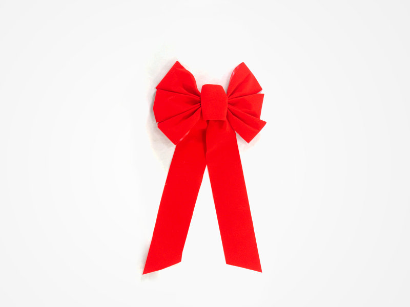 The bow has seven loops, is 9" wide, has a 13"tail, is made of #40 red velvet ribbon with poly vinyl backing, and is tied with gold cord.