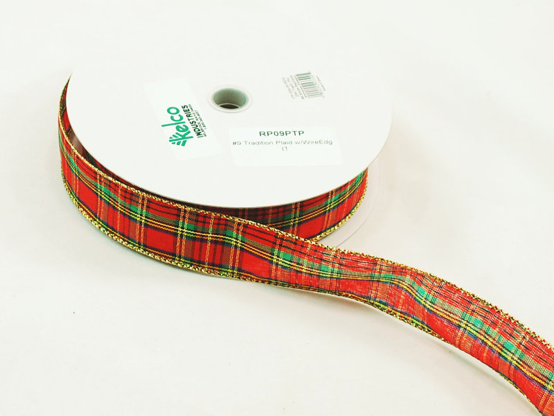This is a traditional red, gold & green plaid on a polyester metallic background with gold wired edge.