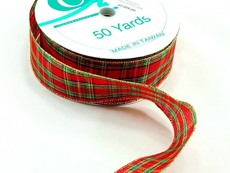 This is a traditional red, gold & green plaid on a polyester metallic background with gold wired edge.