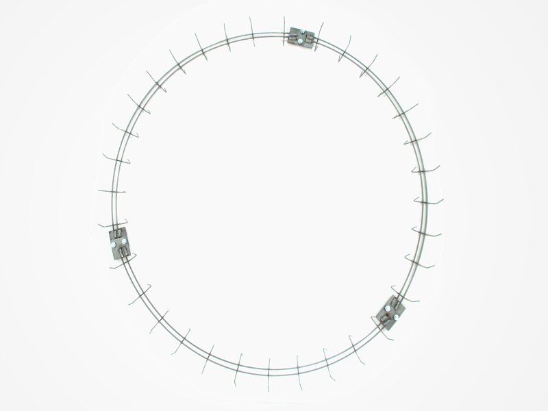 These rings are made with the outer ring being 1-1/2" larger than the inner ring; they are joined together with clamps welded 3" apart all around the ring. This forms a flat 3/4" wide base which your material can easily clamp to. The ring is then cut into three equal sections; joining plates are welded into place and the result is a 3-piece ring which can be shipped via UPS and easily reassembled. They are great for making giant wreaths, the outside diameter of this ring finished should be 40" to 44".