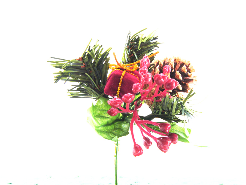 A lovely pick decoration with burgundy berries, a burgundy gift box and a small pine cone, all with a holly and fir backing. Perfect for those times when a burgundy decoration is called for.
