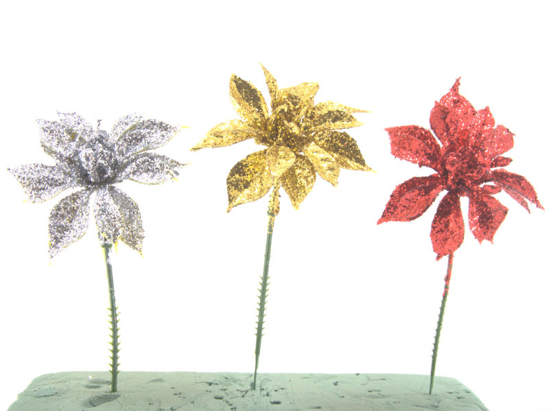 These plastic pointsettas are covered in shiny glitter and will be sure to grab the eye of your customers.This colorful pick comes in an assortment of RED, GOLD, & SILVER.