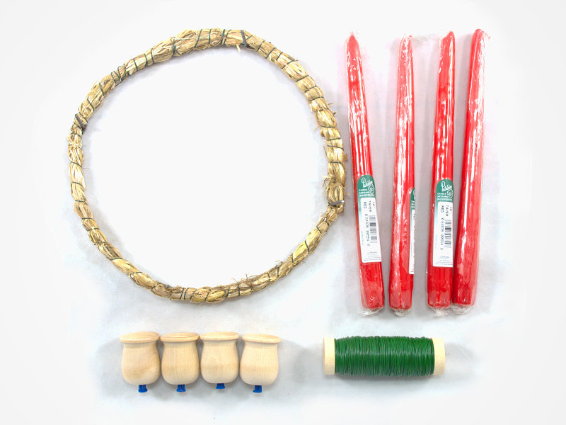 Centerpiece will be made in the same manner as a single faced wreath. Best results will be obtained if greens are cut approximately six inches in lengh to make up the greens bunches. Start applying the first bundle of greens midway between any two candle cup pins. Continue around the entire circle until the starting place has been reached and then finish off the wreath. Place the four candle cups over the pins and carefully adjust them until the candles are upright. If the centerpiece is placed on a dish, water may be added. This will moisten the hay and help keep the greens fresh. The candles may be removed and the base placed in the refrigerator to extend the life of the centerpiece.
