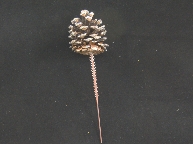 This natural pine cone is on a 5" pick and has a sprinkling of silver glitter on the tips to give it that frosty look.