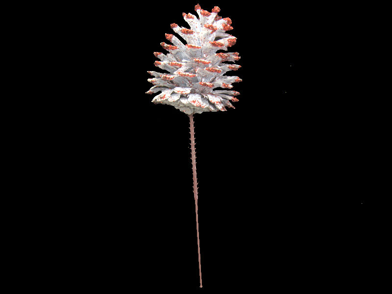 This natural pine cone is on a 5" pick and has been painted white and then sprinkled with red glitter to give it a little sparkle.