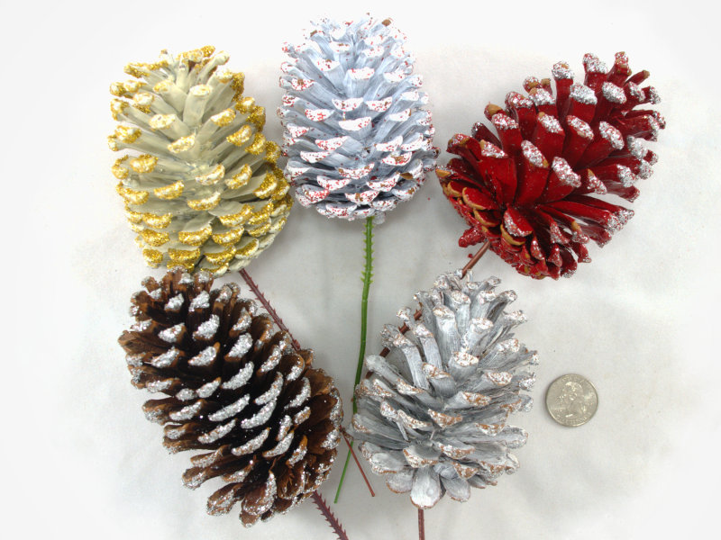 This assortment of cones includes 18 of each color of our extra large painted pine cones.