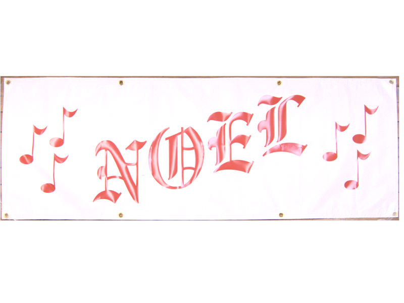 This is a heavy duty vinyl banner for retailers. The 5 foot banners have white backgrounds with green graphics and lettering. This banner says 'Noel'.