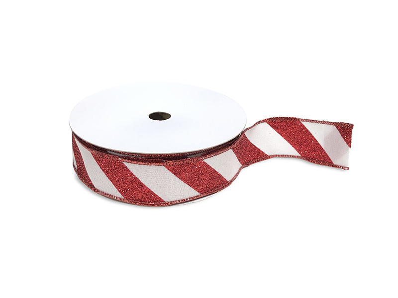 Sparkling red and white Candy Cane pattern ribbon with a wired edge.