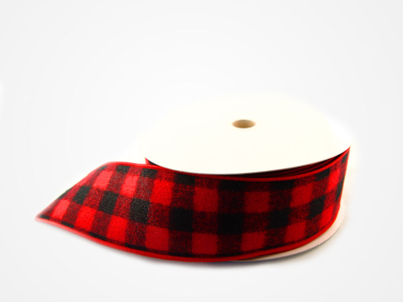A brushed muslin ribbon with a red and black check design. The wired edges make it easy to work with.