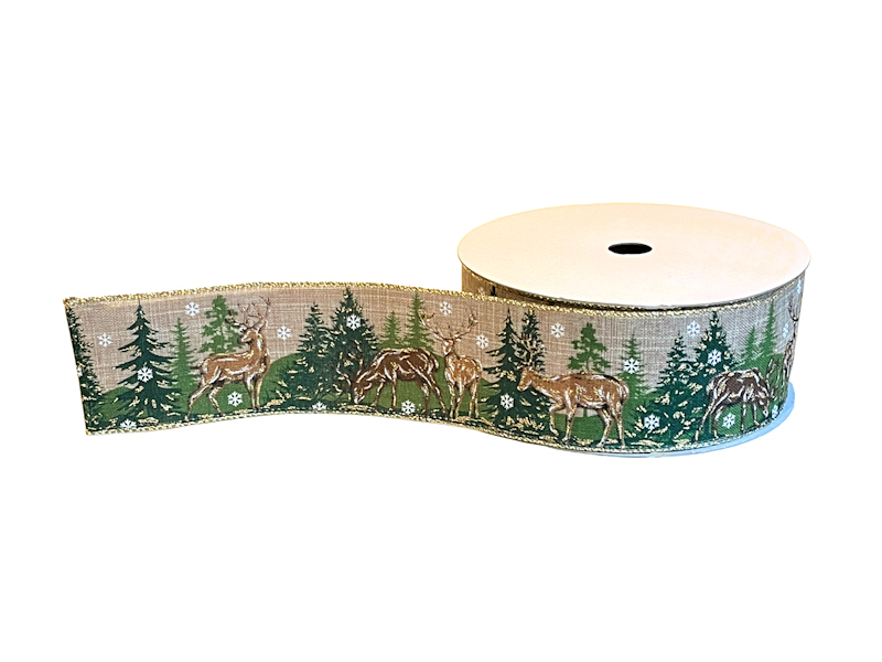A tan burlap ribbon with a design of Bucks, Forest and Snowflakes. With a gold wire edge for easy bow making.