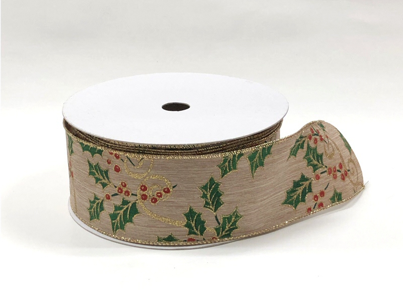 Wire edged natural linen ribbon, with a beautiful green, gold, and red holly design.