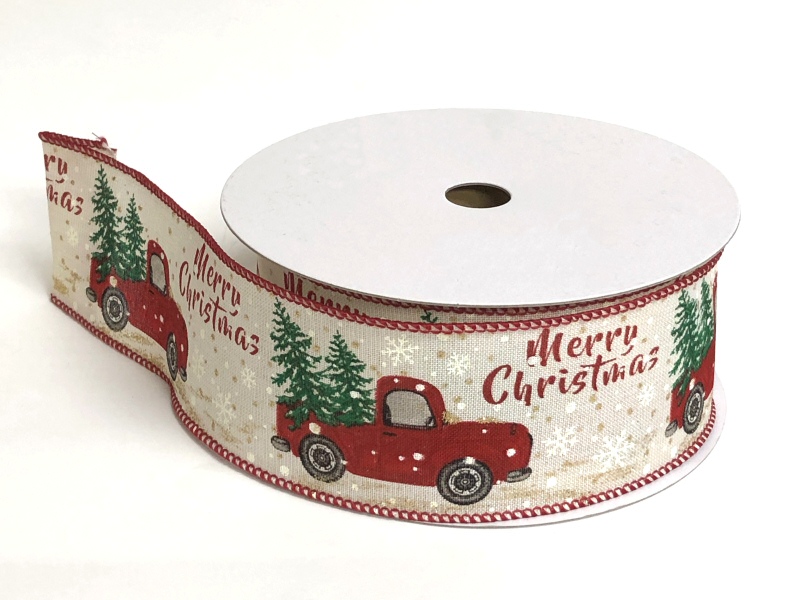 Wire-edged ribbon with a snazzy design of a red pickup truck and Christmas trees printed on a cream-colored background.