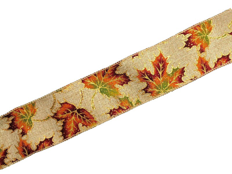 A wired edge ribbon with colorful autumn maple leaves on a beige background.