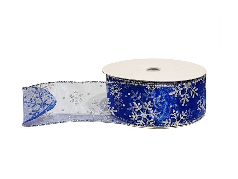 A sheer blue ribbon with a glittery design of silver snowflakes. The wired