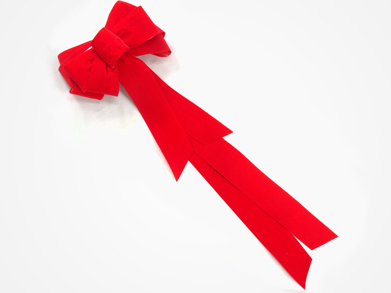 This bow is made with #40 ribbon, has 12 loops, making the diameter approximately 11" and has four tails ( two 24" long and two 14" long). The bow thickness is 6".