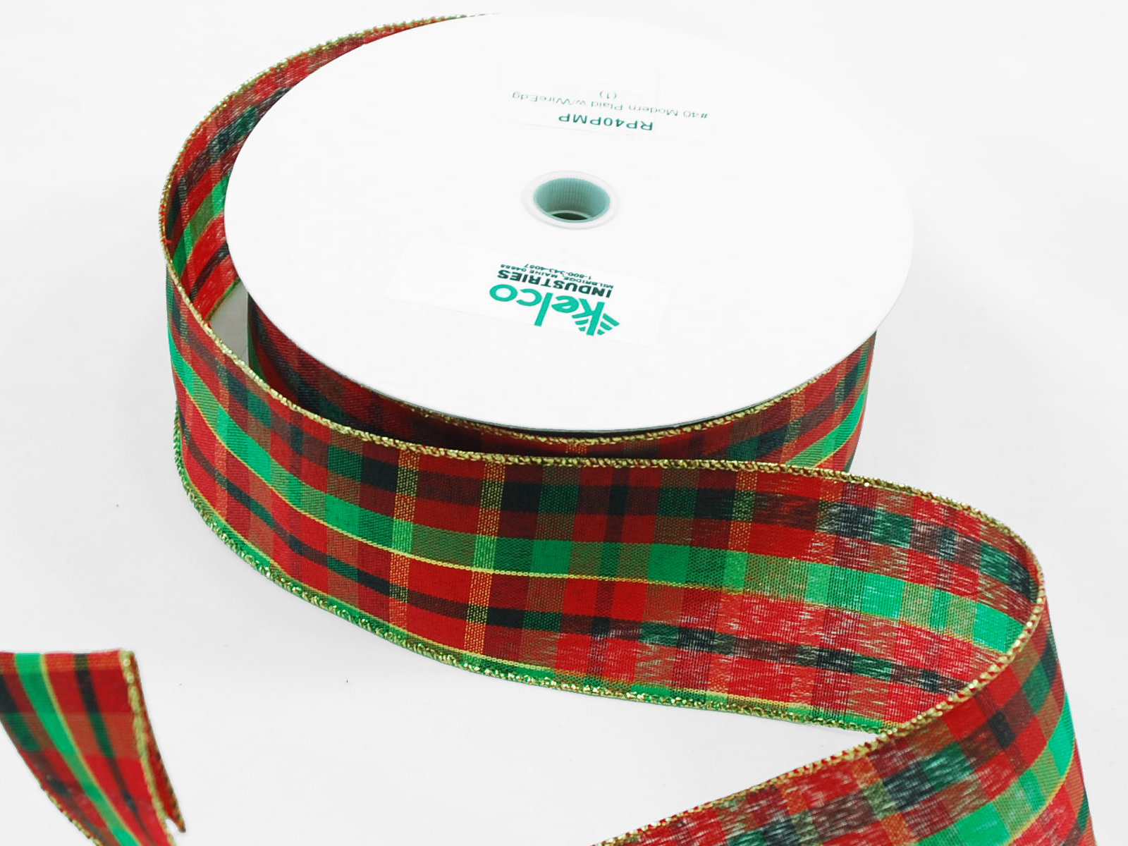 Modern Red, Gold & Green Plaid on a polyester background with gold wired edges.