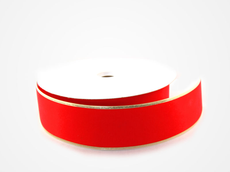 Weather resistant. This ribbon is 2-1/2" wide and is on a 50 yard roll. It's is a Red velvet ribbon with a Red poly vinyl backing. The edges are wired and trimmed in shiny gold. This ribbon is handsome, durable and economical.
